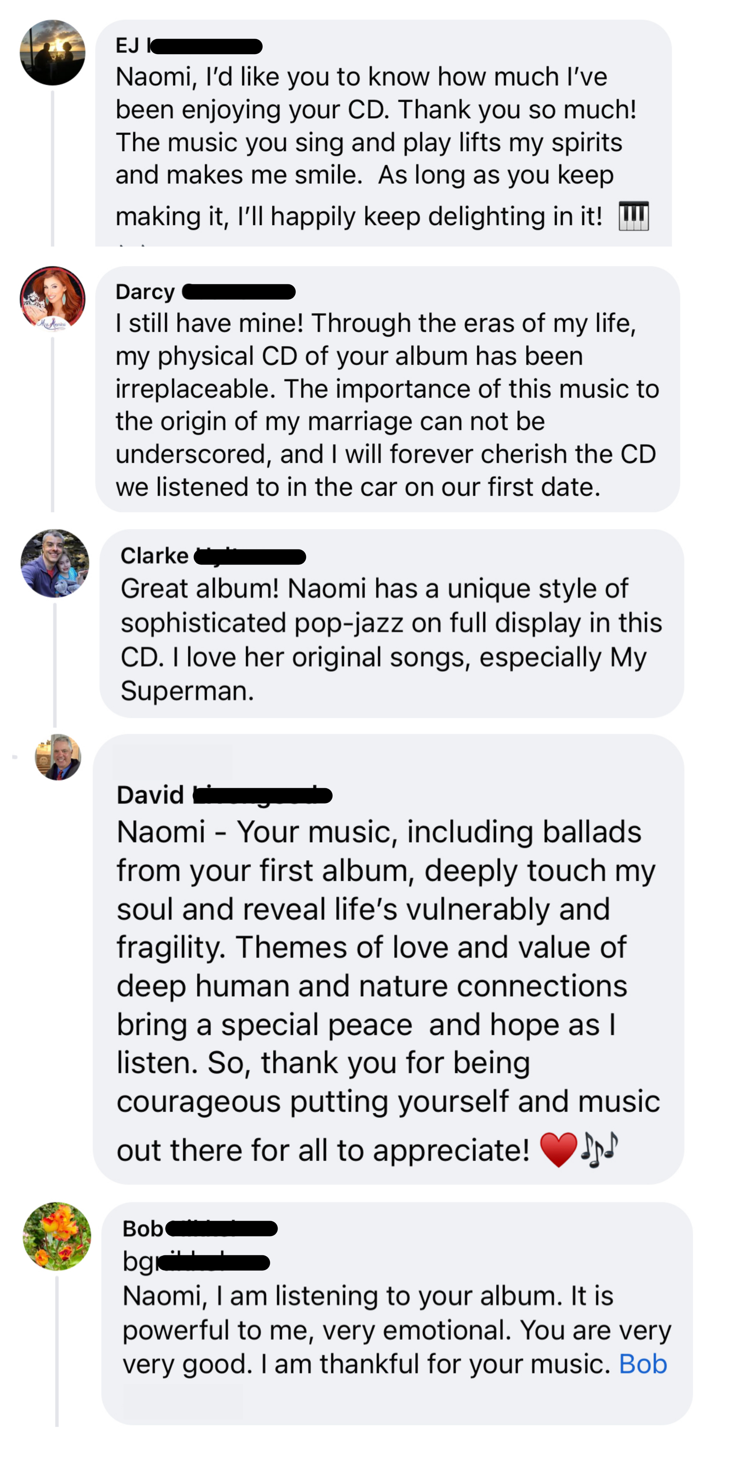 “Naomi’s music is intimate, welcoming, and cozy. In the moment. This debut album is full of unexpected textures and turns. Both in the instrumentation (strings!) and dynamics..The lyrics evoke one’s own experience but through a Naomi-lense. Which is a wonderful way to view life. Familiar somehow, because we’ve all been there, in relationship, and small moments of life. Naomi often suggests in her songs, to love her for who she is. To make a commitment. I do!"