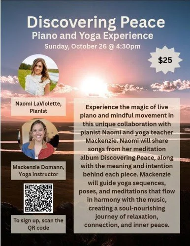 My Lucente Skye piano music from the Discovering Peace album with guided light vinyasa and yin yoga by Mackenzie Domann - personal trainer, wellness coach and yoga instructor. Tickets are very limited in this beautiful and intimate yoga space, only a few left!
